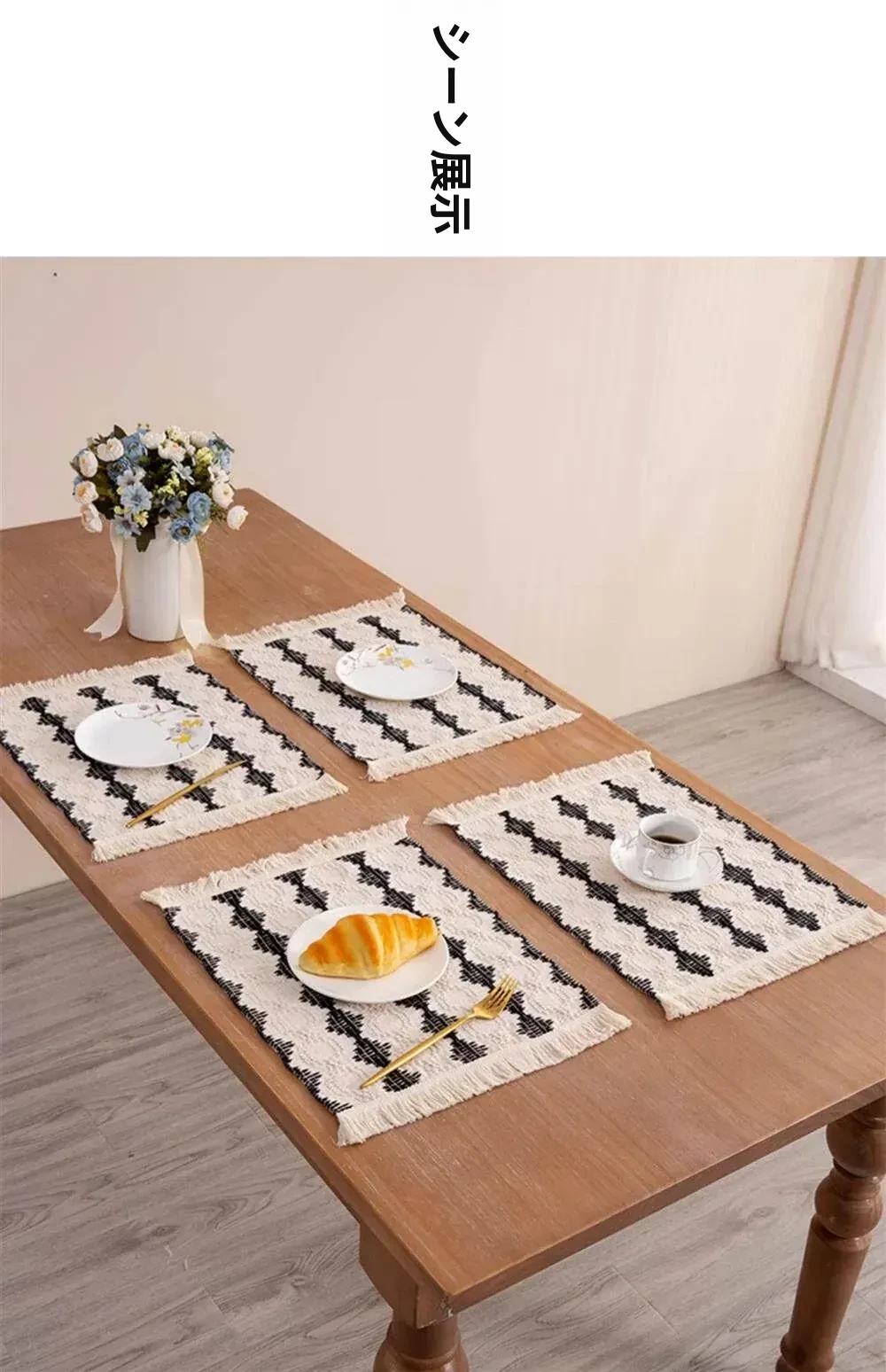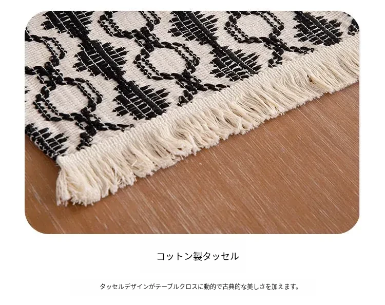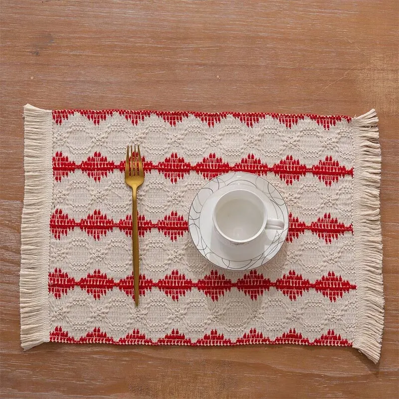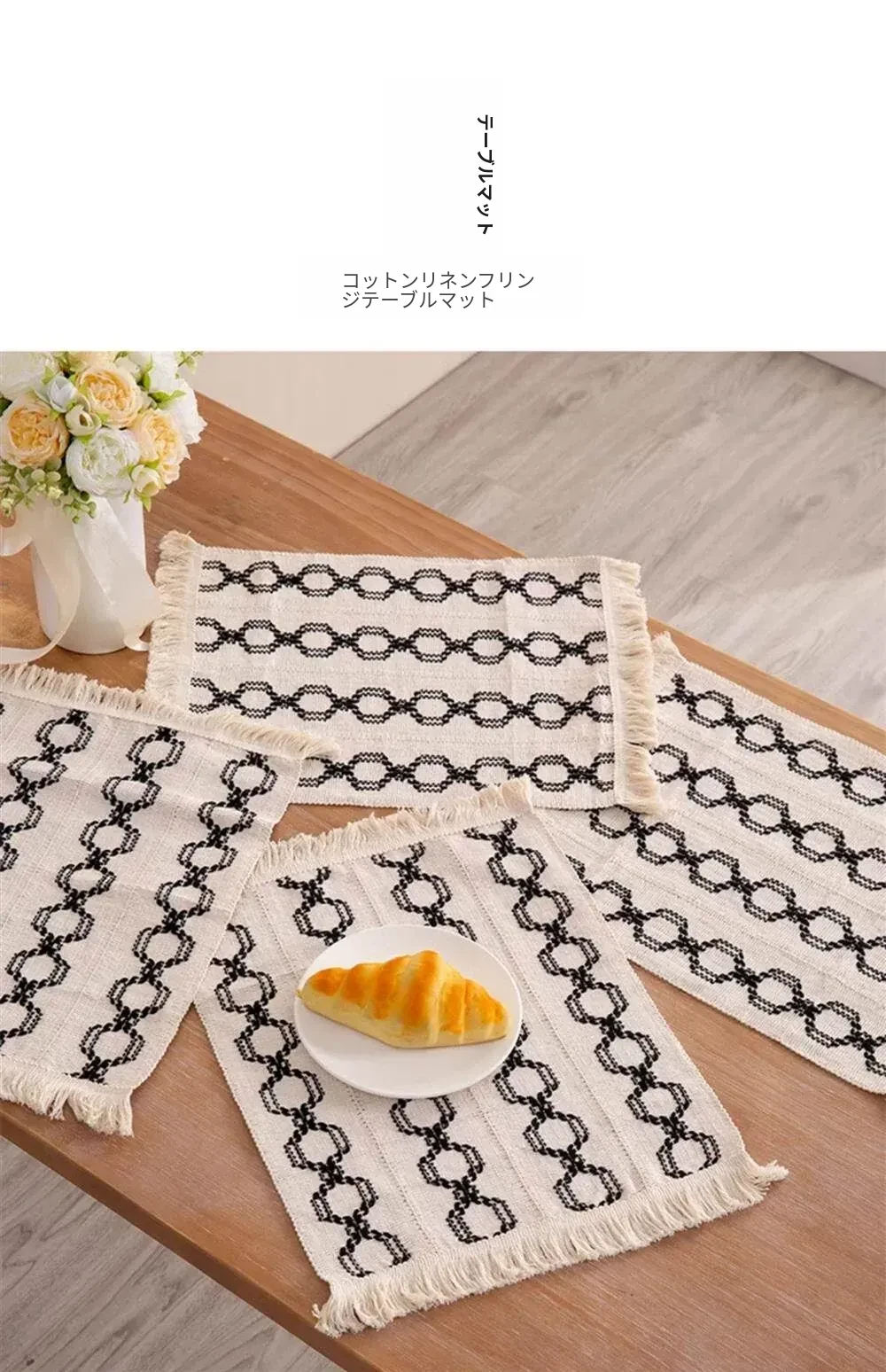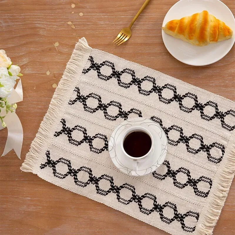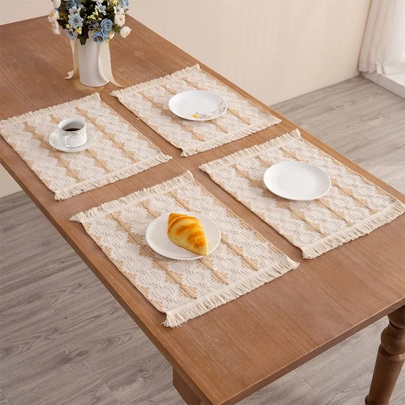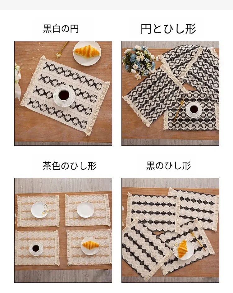 高級感漂う麻素材の編み込みテーブルマット - おしゃれな流行のフリンジ付き、耐熱性に優れた食器マット。インスタ映え間違いなしの和風デザインで、食卓を華やかに演出します!