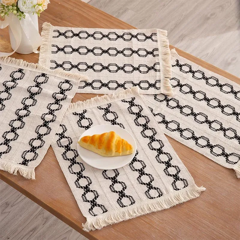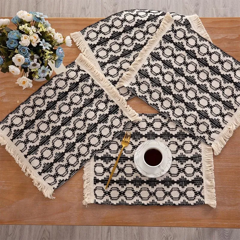 黒い円と四角模様のフリンジ付きランチョンマット