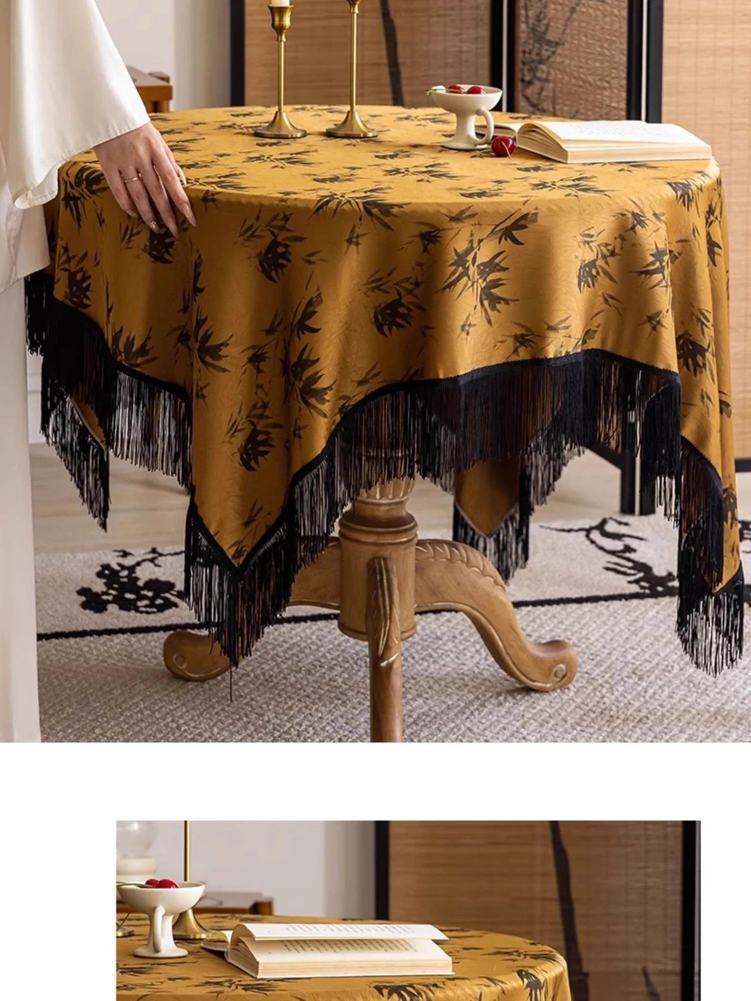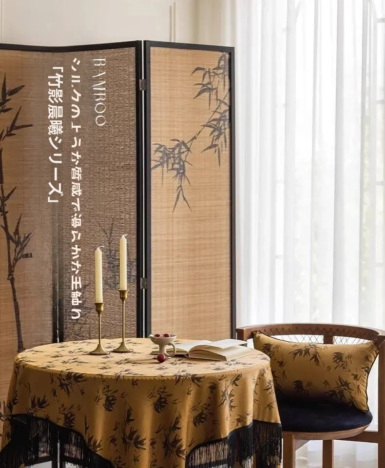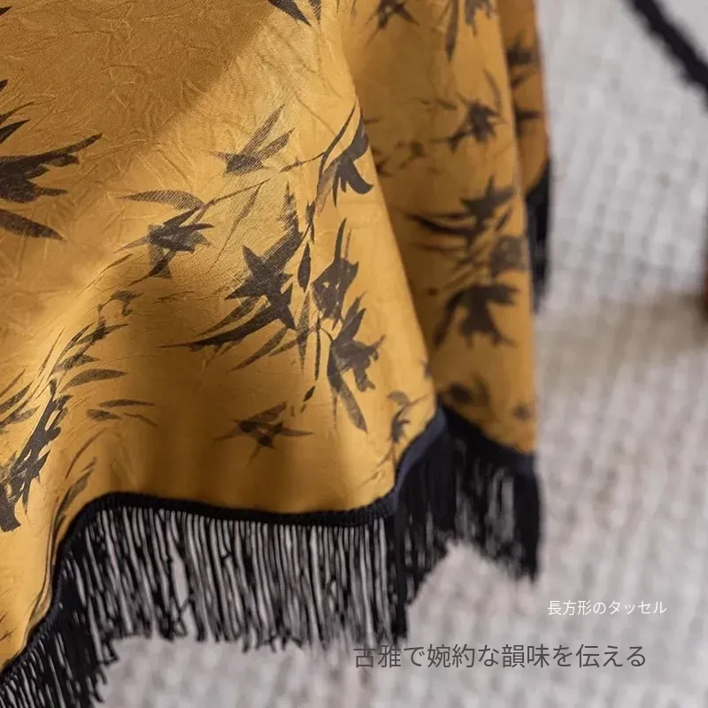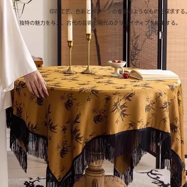 新中式デザインの長方形テーブルクロス - 中古風の房飾り付き、雰囲気満点の黄色中国風ラウンドテーブル用布。おしゃれな茶席を演出し、和の心を感じる一品!