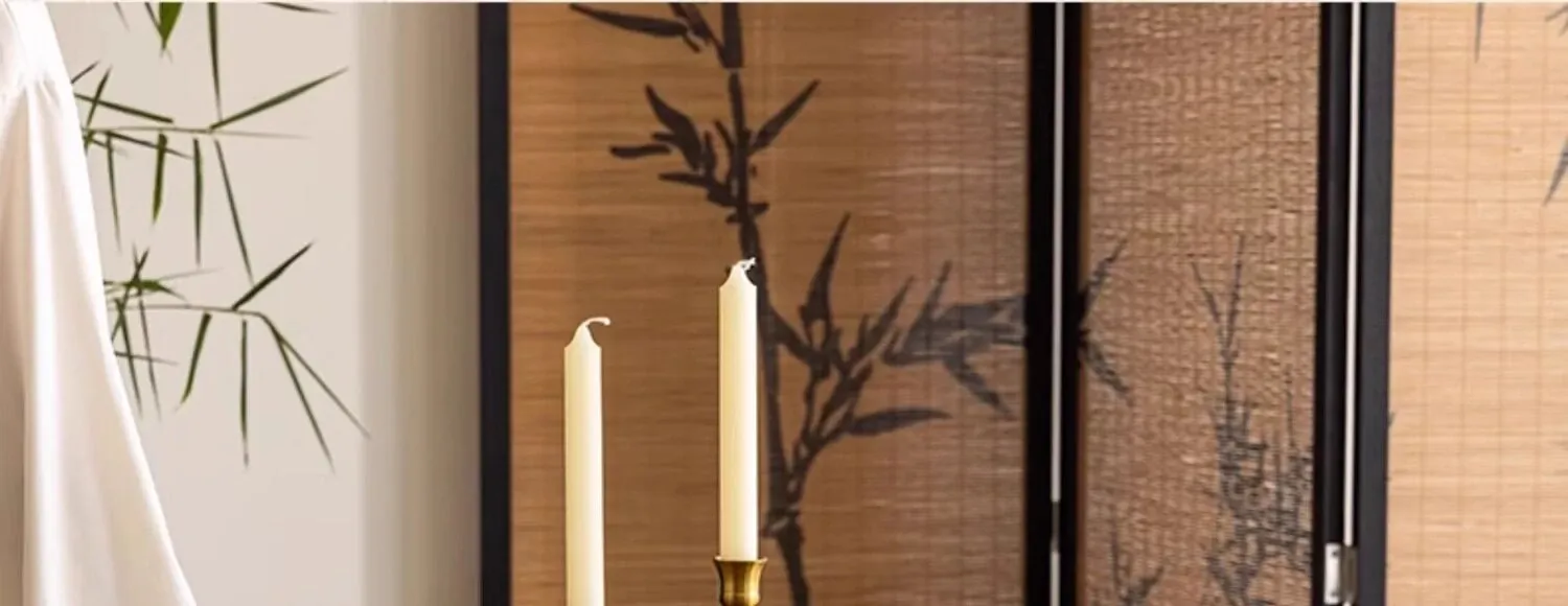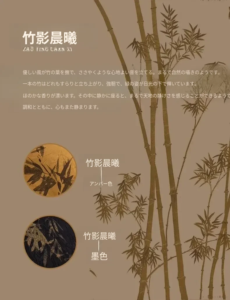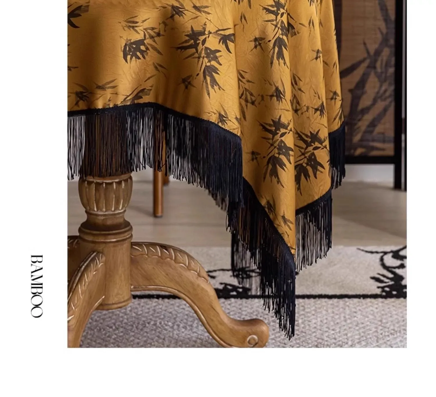 竹影の朝の光に照らされた琥珀色の流れるフリンジの円形テーブルクロス