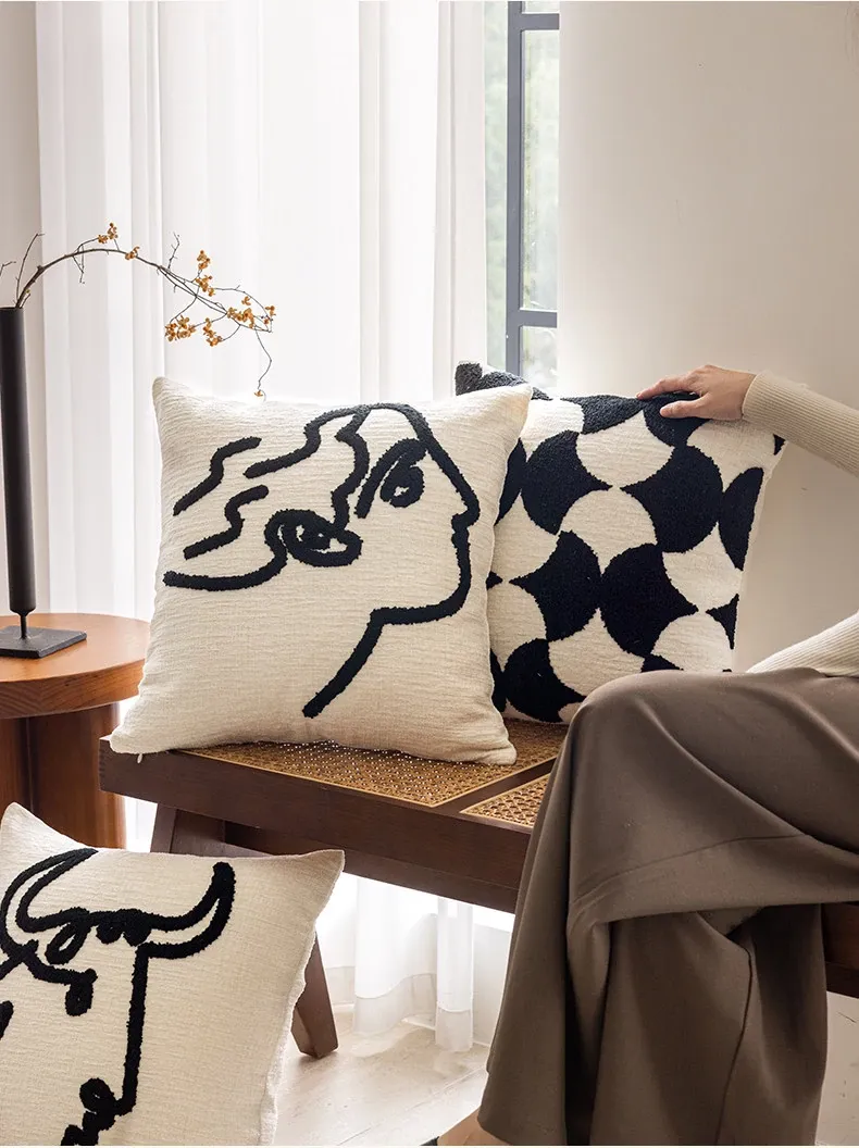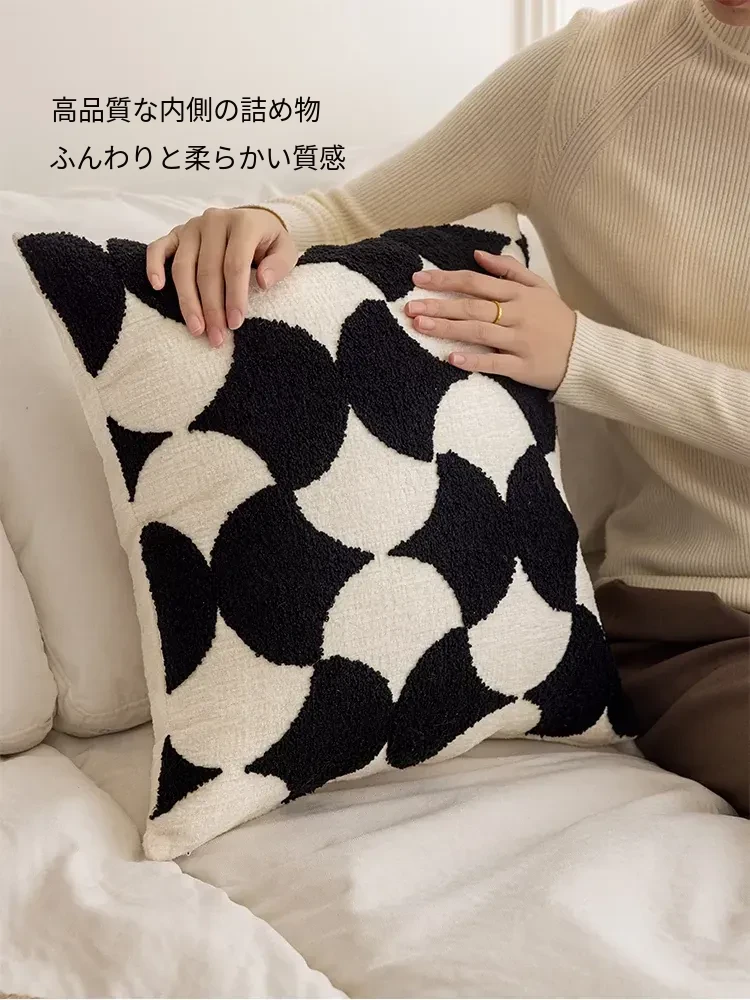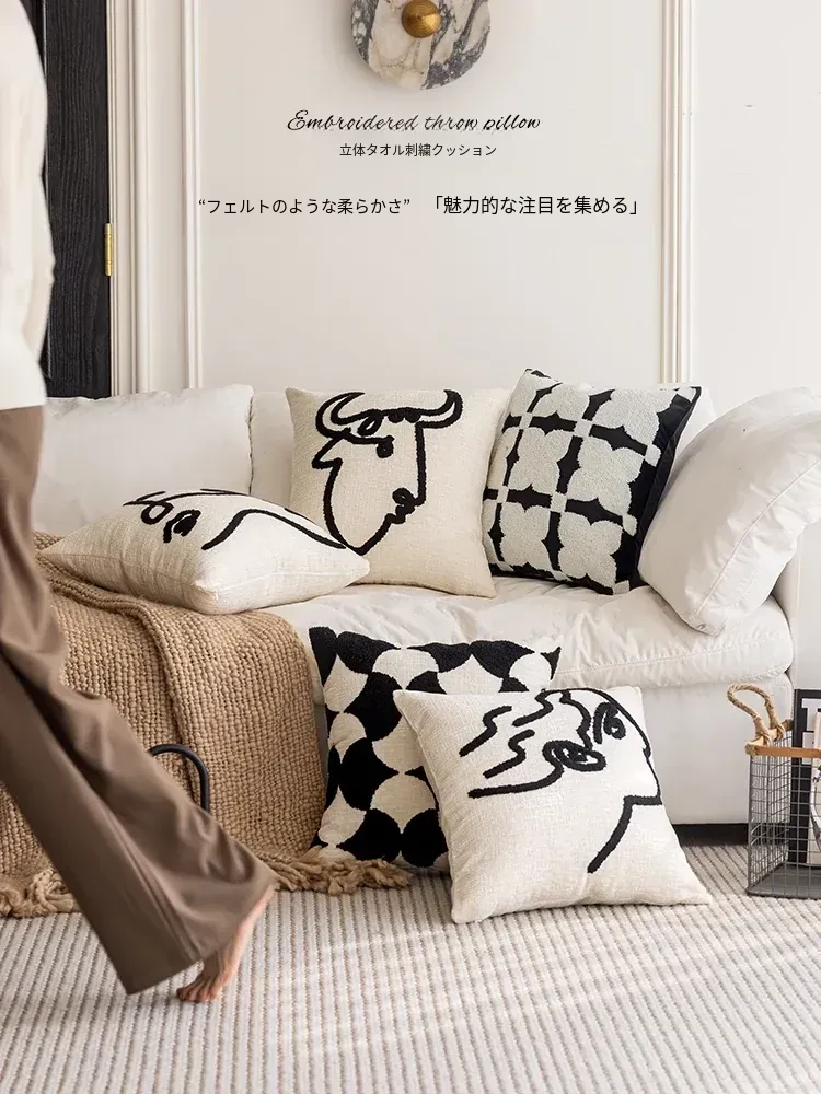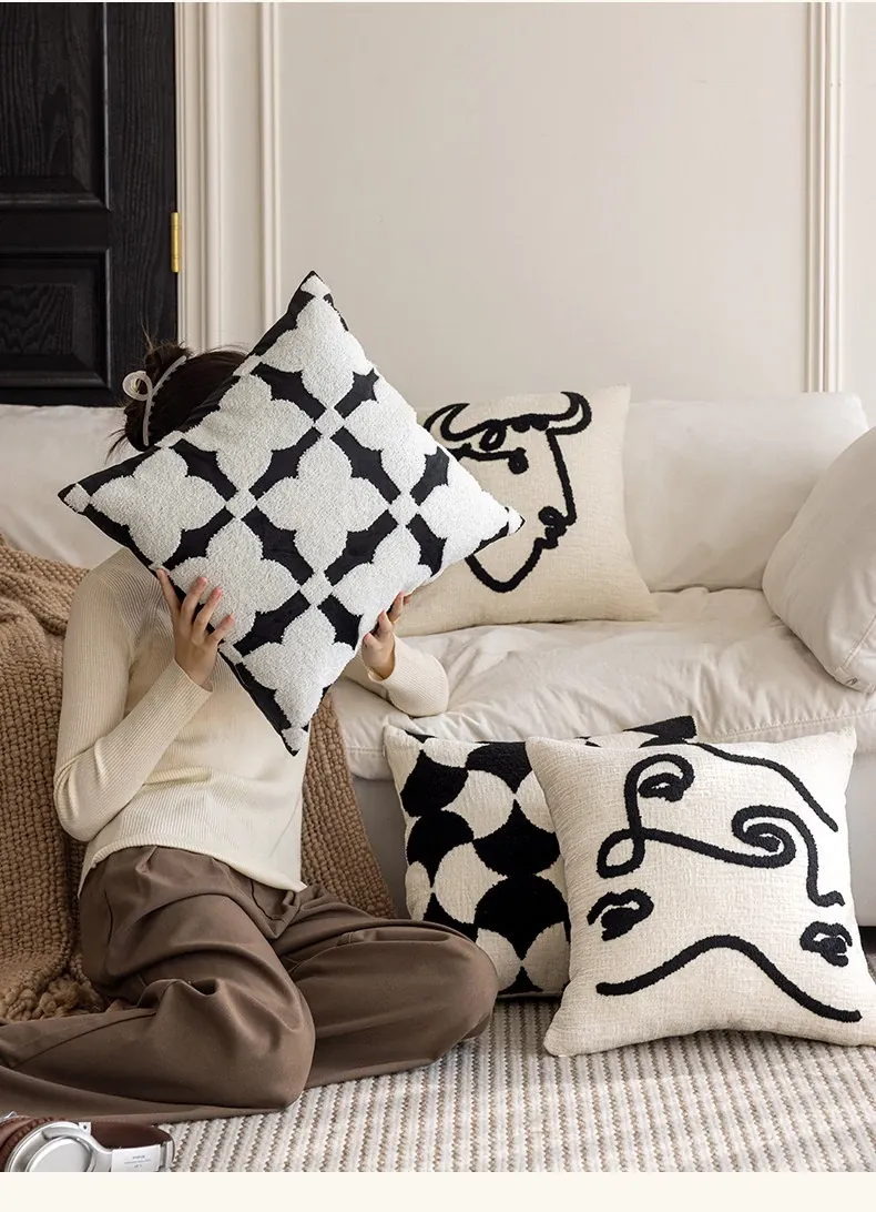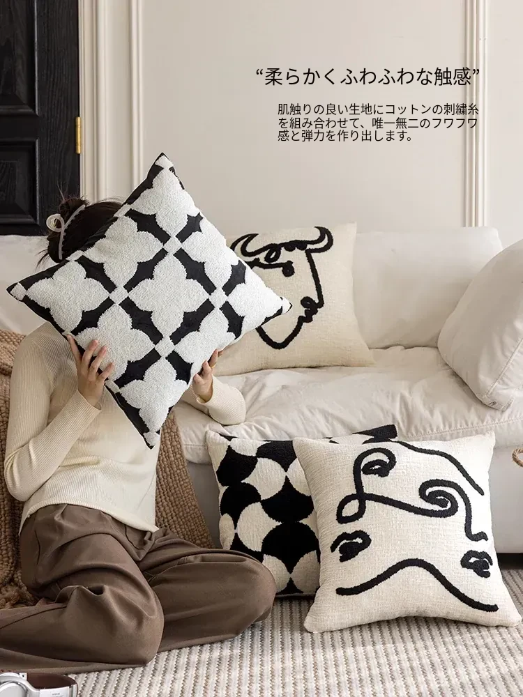 シンプルなフレンチスタイルのブラック&ホワイト、北欧風の軽やかでラグジュアリーなクッションカバー。リビングルームやソファにぴったり、ライン刺繍デザインのホテル仕様のクッション。おしゃれな空間を演出します!