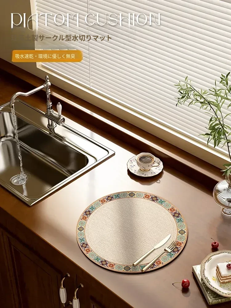 アメリカンスタイルの円形ドレイニングマット、シリカゲル吸水マット!キッチンカウンターにぴったりの防滑・耐熱設計、洗浄不要でお手入れ簡単!小サイズのティーマットとしても最適。